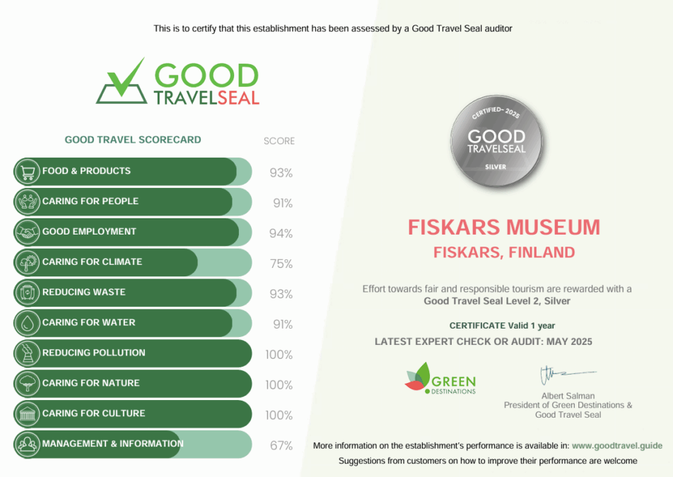 Fiskars museum har i maj erhållit certifieringen Good Travel Seal (GTS). GTS är ett miljöhanteringssystem som utvärderar företag och andra aktörer inom främst turism och resebranschen. Fokus ligger på miljö – och klimatfrågor, samt på ämnen som socialt ansvar, säkerhet och hälsa. Läs mera om GTS här Green Destinations | Good Travel Seal.